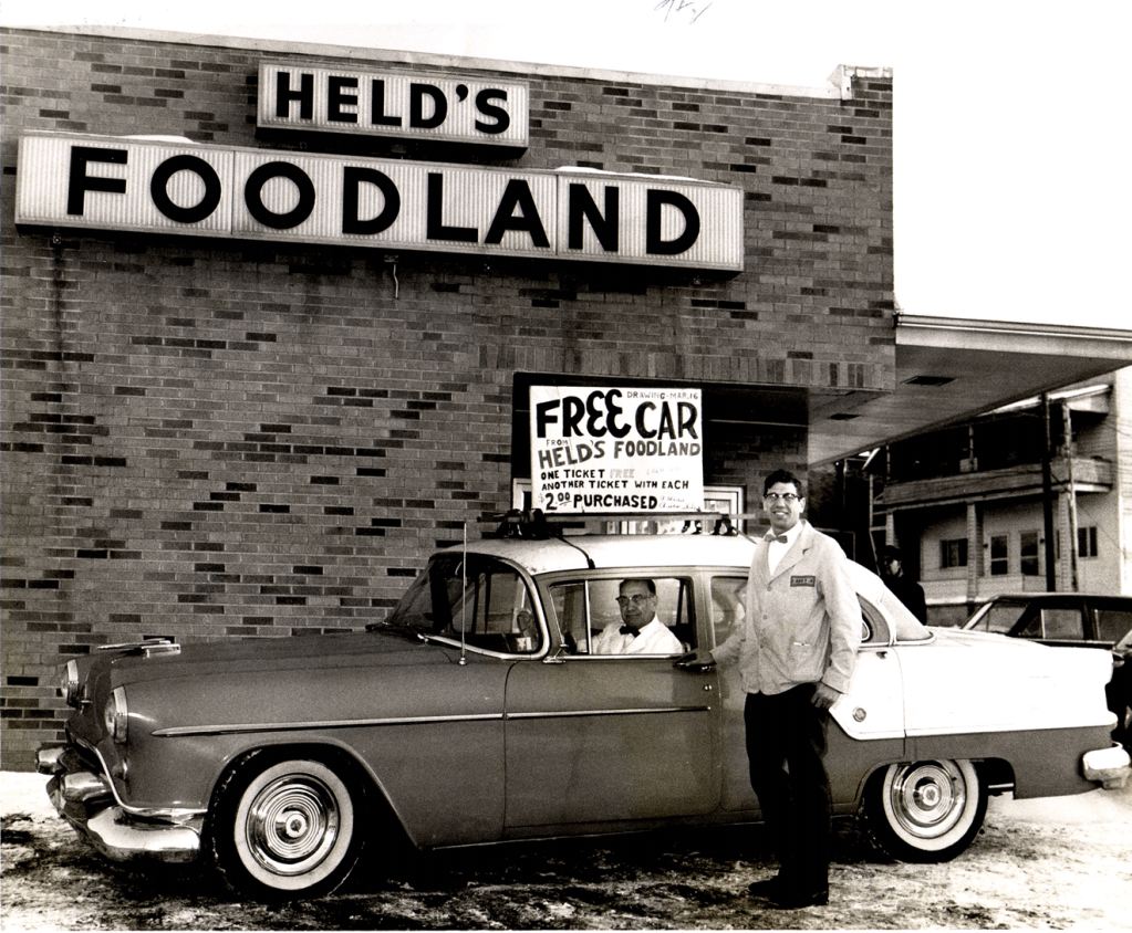 In 1960 Daniel Sr. decided to retire. He gave the store to his sons. In 1960 they decided to build across the street, corner of 16th and Allison Avenue. Land was bought from Mrs. Varner in November. Trees were cleared & the building was removed as the groundwork began. In March 24, 1961 the footer was poured. The Grand Opening for Held’s Foodland was on Oct. 13, 1961. Later the store was changed to the Red & White Foodmart and then to Held’s Shop & Save. The picture to the left is Daniel Jr. and Margaret Connor in 1961 or 1962.