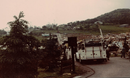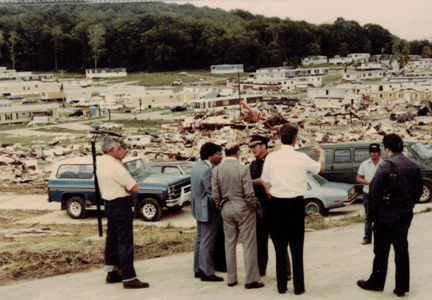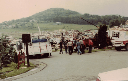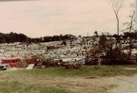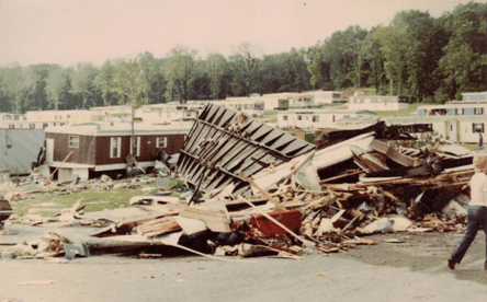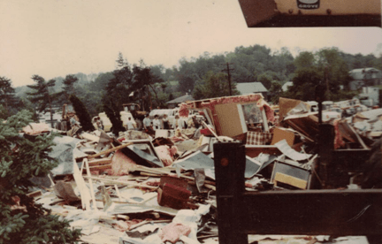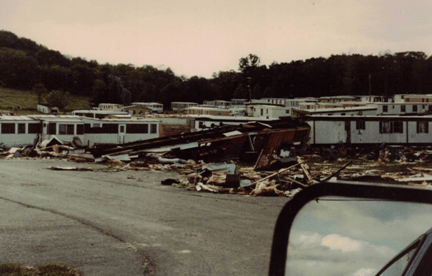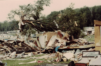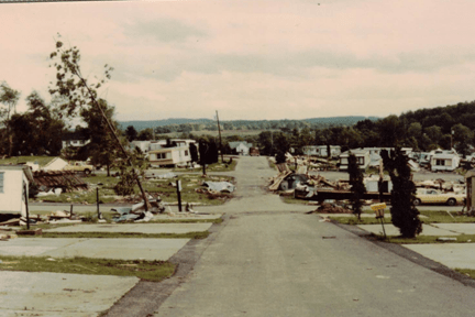 Residents of Apollo do not expect to experience tornadoes.  We are under the impression that the hills surrounding our small town will protect us.  In the summer of 1980, we learned otherwise.  On June 3, 1980, nine tornadoes ripped through four counties in Western Pennsylvania, leaving a 50-mile-long trail of damage. In the Edgewood Estates Trailer Park in Apollo, 77 trailers were destroyed and 46 were damaged. According to John O’Donnell from the Valley News Dispatch, this tornado happened because  “in a small area just off the western edge of Lake Erie, something unusual in the weather pattern happened.  Cold dry air from Canada converged with the warm moist air from the south.  What made this a problem was the presence of a high energy jet stream in the area.  Combined, this made a volatile atmospheric mixture.”  This moving air turned into a tornado that struck the Kiski Valley, as well as other places in Western Pennsylvania and surrounding states.