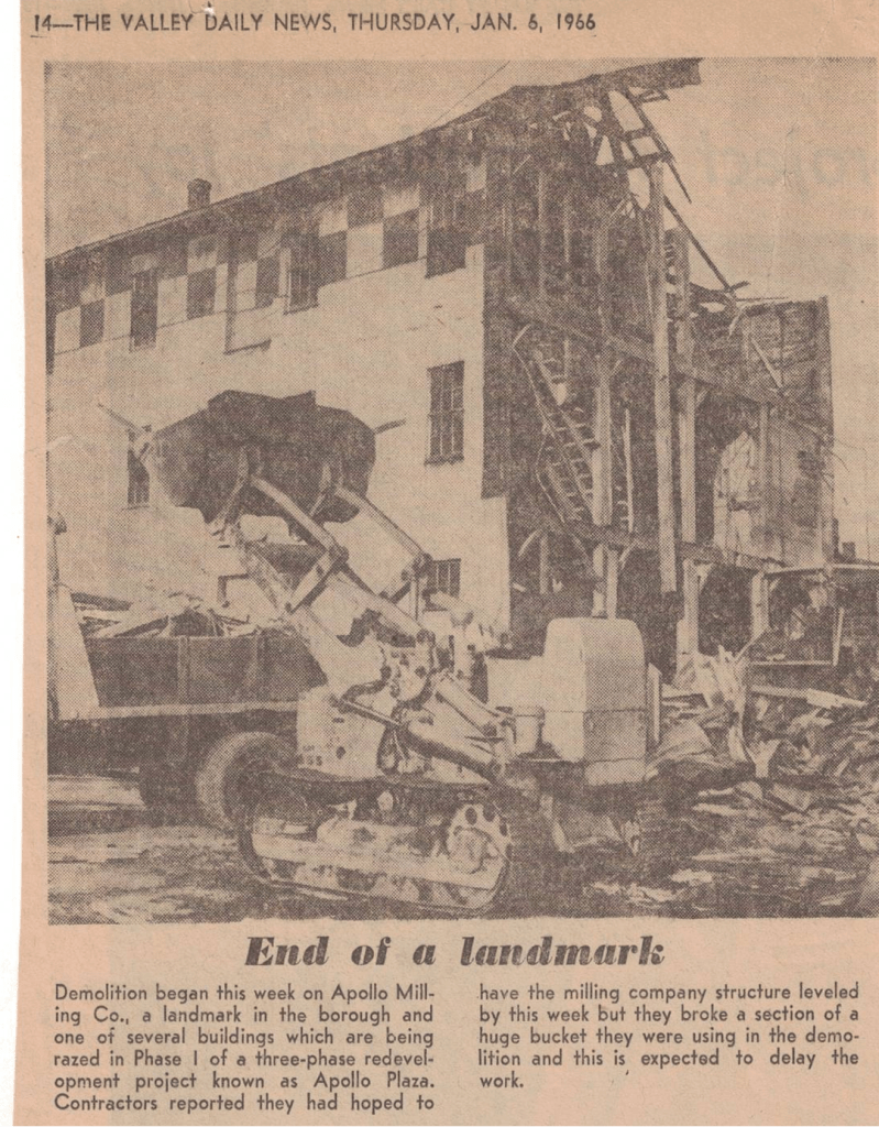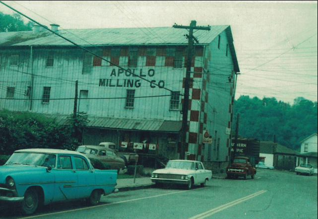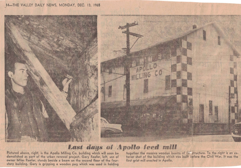 The following articles and photos tell the story of the Apollo Milling Company, originally built on North Second Street in 1849. In 1966, the old building was torn down and the new building was erected along River Road in North Apollo, as shown in the photo above. The following article gives a very complete history of the old feed mill. The mill is owned now by Dennis & Betty Reefer and Sons.