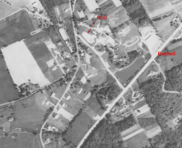 From an email from Bill Ryder, formerly of Washington Township: “I lived in the upper part of the building beside the pool (it was a 4 bedroom apartment at the time) from 1971 to 73. The pool was indeed located near the Firehall as can be seen in this aerial photo from 1967.”
