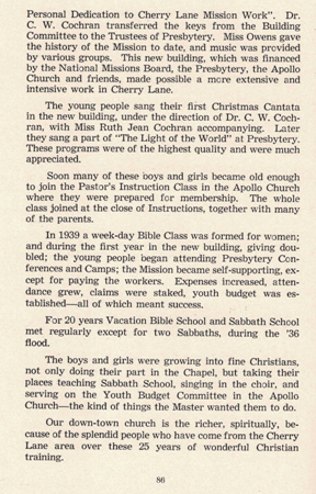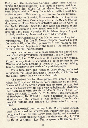 These pages about the Cherry Lane Mission come from the “History of the First Presbyterian Church of Apollo, PA”. Part One was written by Frank W. Jackson and published on June 12, 1925 and Part Two was written by R.H. Ankeny and published in 1950.