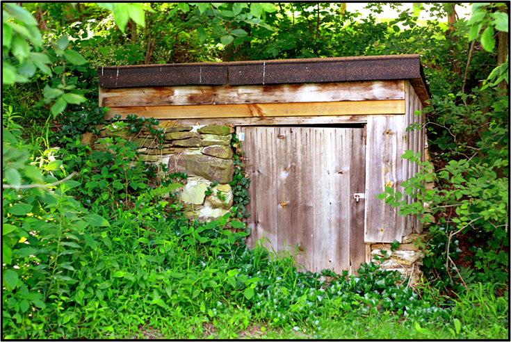 There are many special features of a log cabin. The photo on the left shows window and the log & chinking construction. Concrete mortar was used instead of the mud mortar because of durability. The top right photo is of the springhouse which encloses a concrete cistern. The springhouse was a source of water as well as refrigeration for the occupants of the cabin. The lower right shows the waterfall & creek behind the cabin. The outhouse was located somewhere in this area.