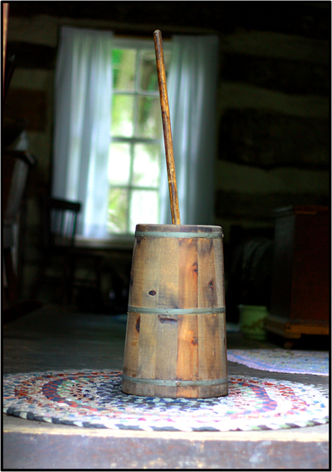 The pot-bellied stove that Mrs. Shirey used for heat and cooking was replaced with a field stone fireplace. Inside the fireplace is a chimney crane used for heat control during cooking. Below is the spinning wheel, butter churn, and a small table with a wash basin, pitcher, and grooming supplies.