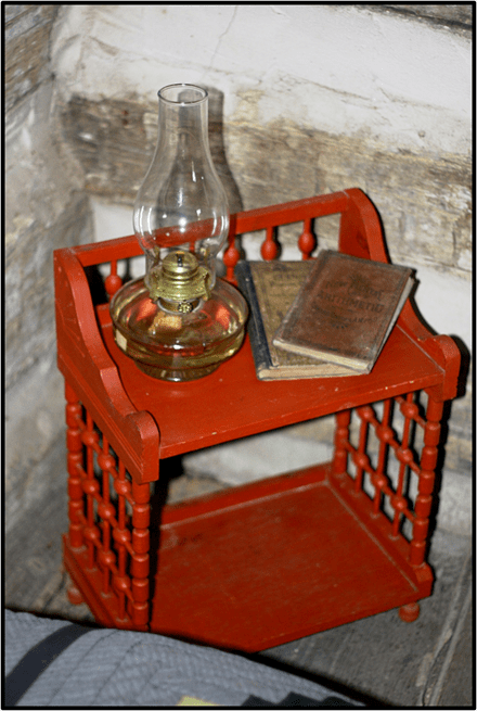 The sewing and knitting corner has an old treadle sewing machine as well as yarn that could have come from the spinning wheel. The bedside table holds an oil lamp and some old books for bedtime reading.