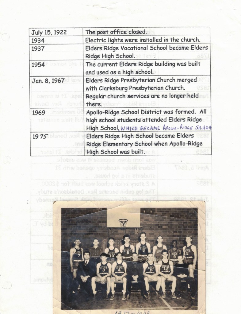 Elders Ridge High School (Allshouse Building) 1933 replaced the Lab/Gym Building that burned in 1932. The Allshouse building burned in 1951. The fire apparently started in the vocational shop by the gym/auditorium. It burned for some time before being noticed and an alarm turned in. With the exception of the four rooms at the front of the building the two-story brick school was gutted by the fire. Huge I beams collapsed when the fire destroyed the roof. The intense heat caused the steels beams to buckle. Included in the destruction were 10 classrooms, the industrial arts room, the combined gym/auditorium and locker and shower rooms. A fire hall, between the western and east-southeastern section of the school was credited with saving the four rooms. The back wall of these rooms, however, were declared ‘not safe’ and will not be available for classroom use. At the time of the fire, there were 425 students enrolled from Young Township, Conemaugh Township, West Lebanon, Indiana County, and Kiskiminetas Township. The home of C.F. Shaulis, principal of the school, located next to the school, was damaged by the fire, but fireman were credited with saving the home. The entire side of the building was scorched by the fire.
