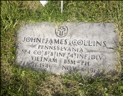 After his high school graduation, John enlisted in the United States Army. His basic training was at Fort Benning, Georgia. John went to Fort Polk, Louisiana for Advanced Individual Training. After his training was completed, he volunteered to serve in Vietnam. His last visit to his home town was in late April 1967. John arrived in Vietnam in May of 1967. He became the Radio Telephone Operator for Captain John Falcone. He served in B Company, 3rd Battalion of the 8th Infantry, 4th Infantry Division, the Ivy Dragoons. The friendships made in this band of brothers were very strong. Several of his brothers in arms have kept in touch with John’s brother, Ron, and two have traveled here to Apollo to visit his resting place. Every Christmas his grave is honored with a wreath of remembrance from his brother in arms, Ed Goehring.