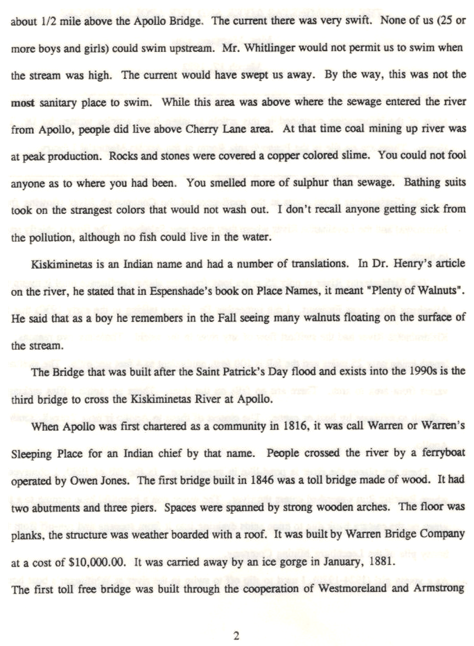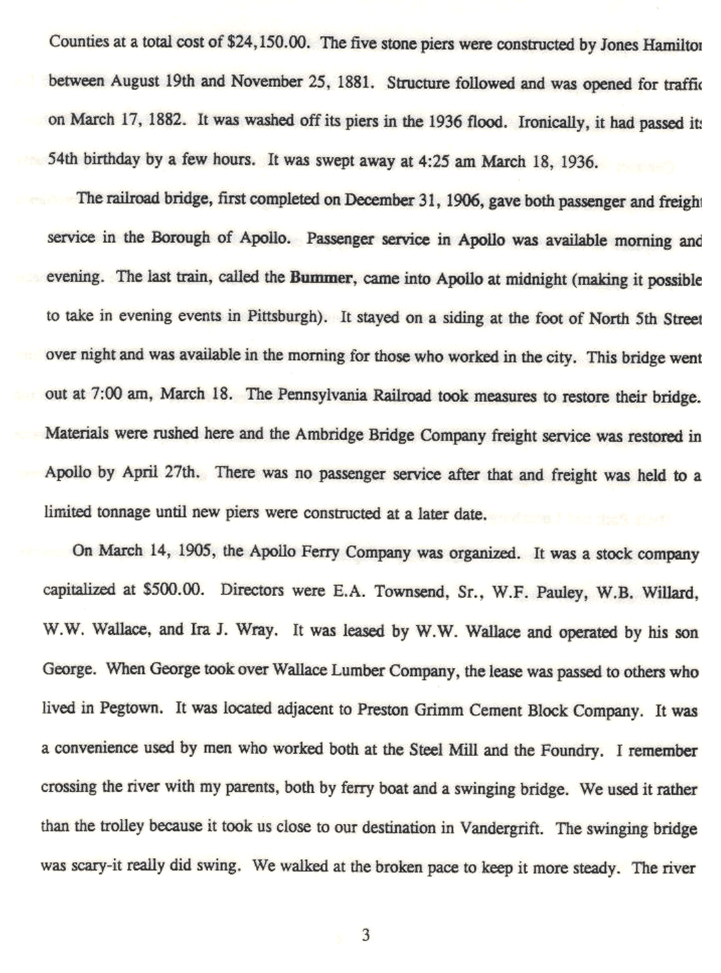 The Bridges Of Apollo Apollo Bridge built in 1881-1882. Destroyed by the St. Patrick’s Day Flood of 1936 1881 Bridge 1881 Bridge Walkway 1938 Bridge Apollo Bridge & Train Bridge The 1881 Bridge before it was replaced in 2003. The brick building at the end of the bridge was torn down also. The Kiski River upstream of the bridge 1938 Bridge and Temporary footbridge 1938 Bridge 1938 Bridge & temporary footbridge coming from S. 3rd Street. To Be Continued… Hope you enjoyed what’s been posted so far! Share this: Click to share on X (Opens in new window) X Click to share on Facebook (Opens in new window) Facebook Like Loading...